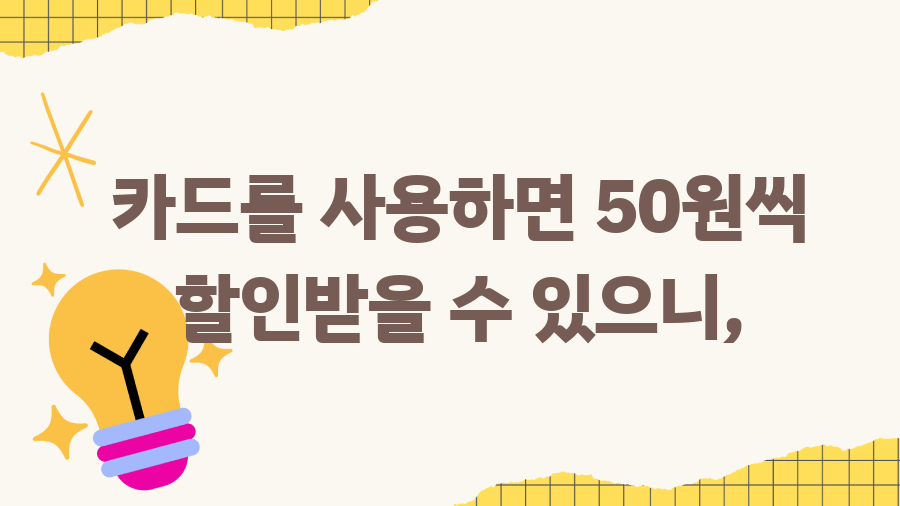 카드를 사용하면 50원씩 할인받을 수 있으니, 교통카드를 사용하는 것이 훨씬 이득이겠죠?